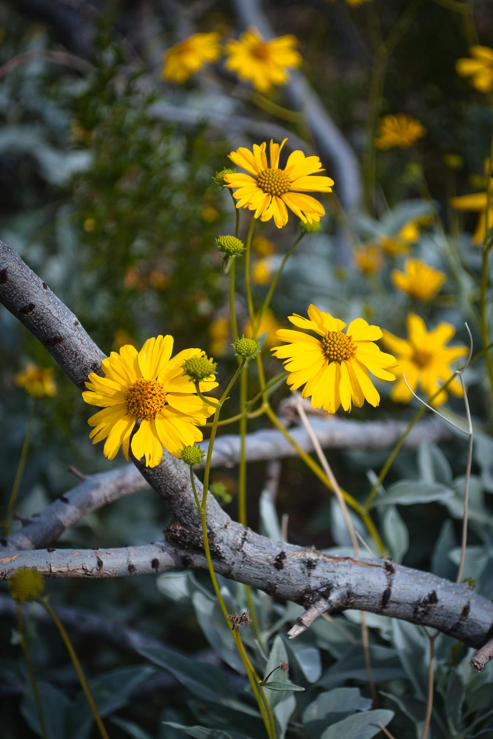 Brittlebush blooms amid creosote bushes in the Phoenix Mountains, AZ