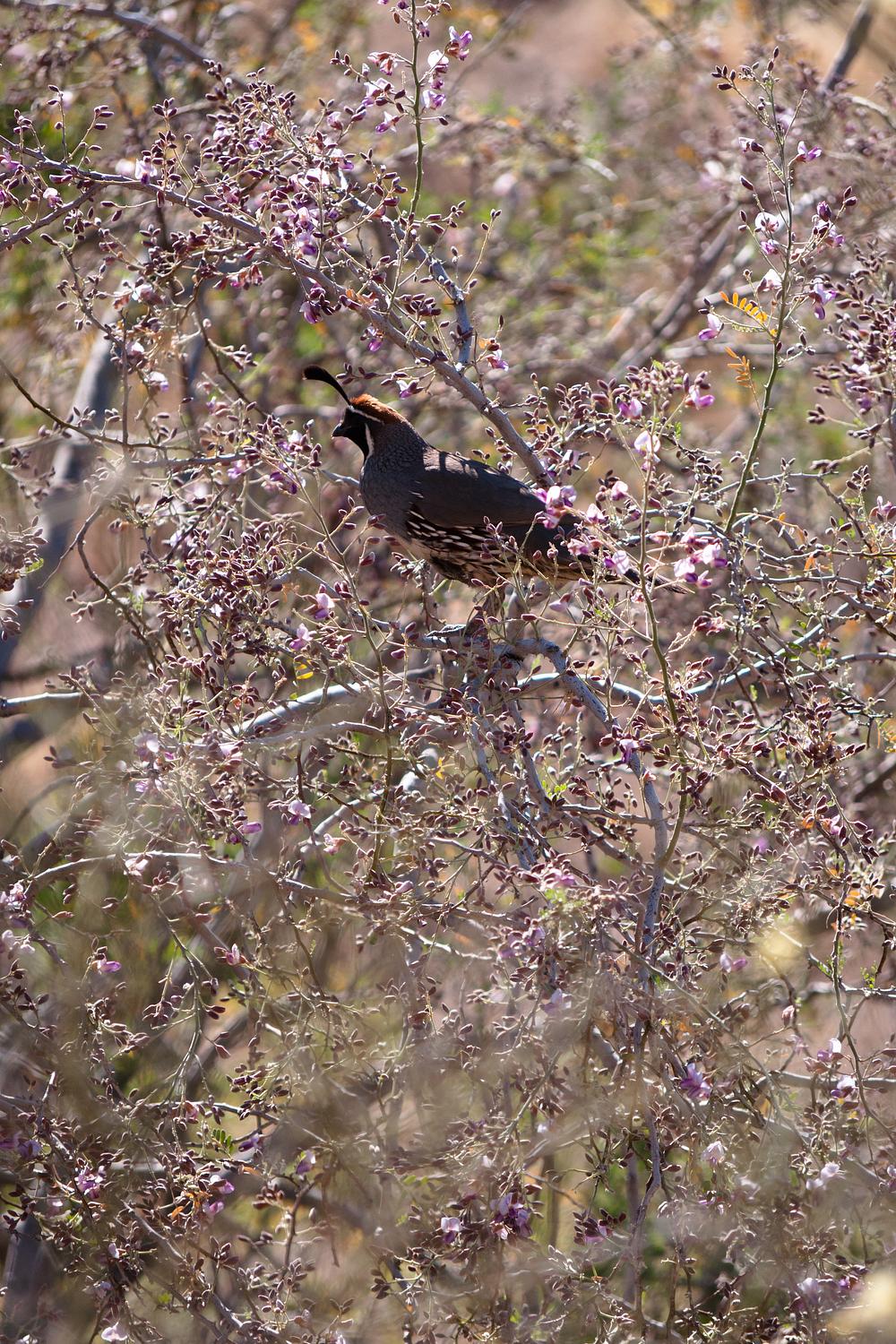 Gambel quail caught eating ironwood flowers in the Phoenix Mountains, AZ