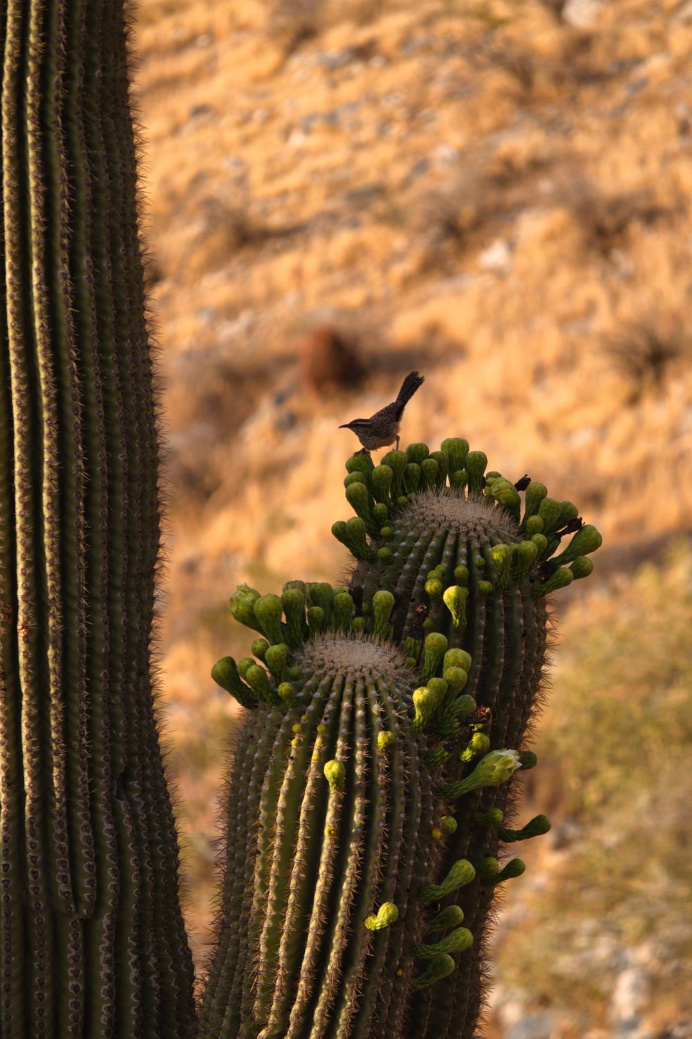 Cactus wren attempts to hurry along saguaro buds in the Phoenix Mountains, AZ