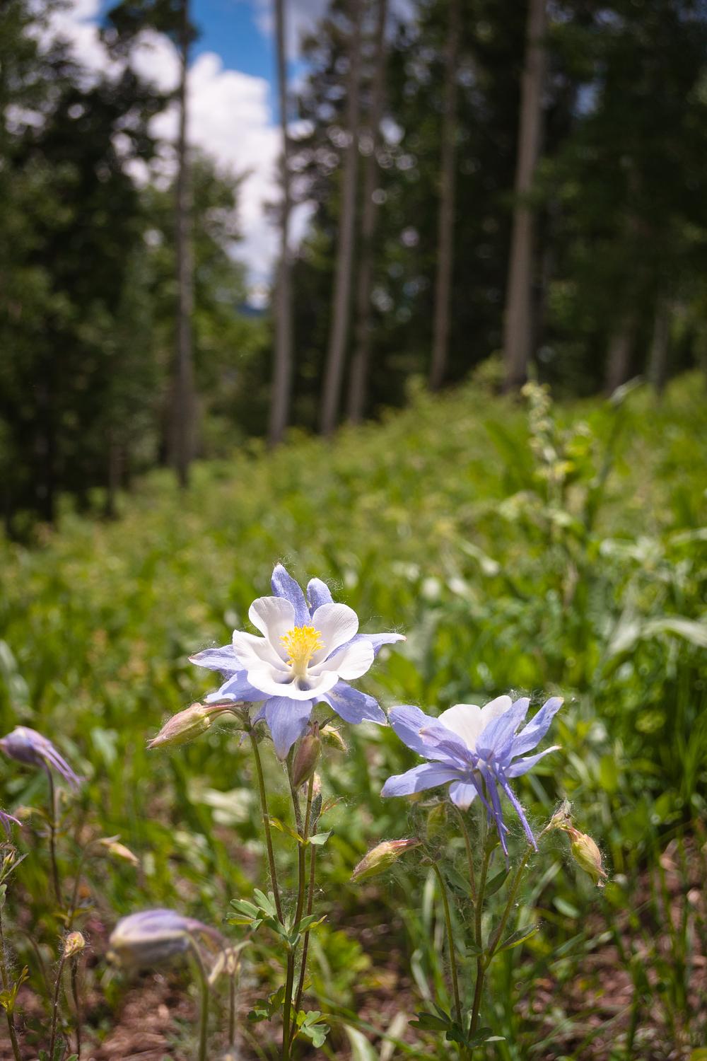 Columbine flowers catch cottonwood fluff on Purgatory Mountain, CO