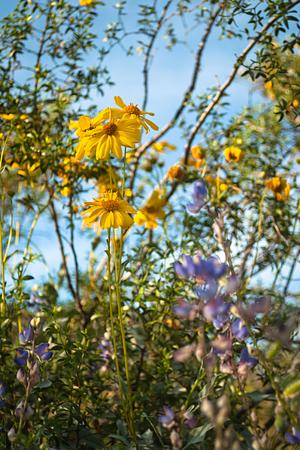 Brittlebush and lupine blooming under a creosote bush in the Phoenix Mountains, AZ
