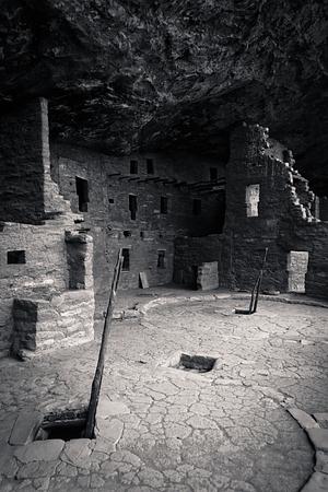Kiva ladders reach from within Spruce Tree House at Mesa Verde, CO